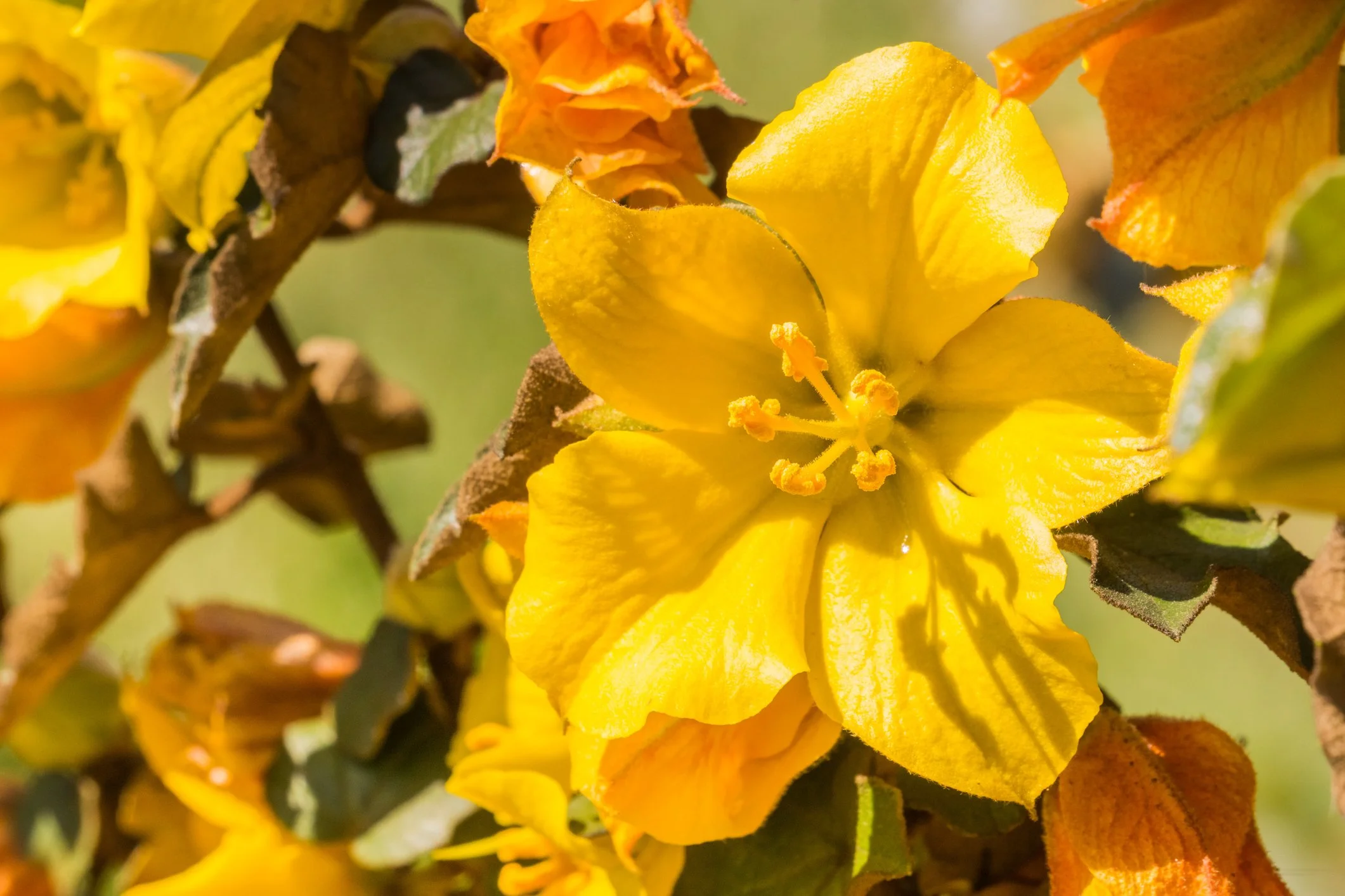 Best known for its spectacular, bright-yellow flowers that bloom during spring and into summer, flannel bush (Fremontodendron californicum) is an eye-catching large evergreen shrub. Its flowers attract butterflies, bees, and hummingbirds. The plant gets its name from fuzzy hairs that cover its leaves, which can irritate eyes and skin.